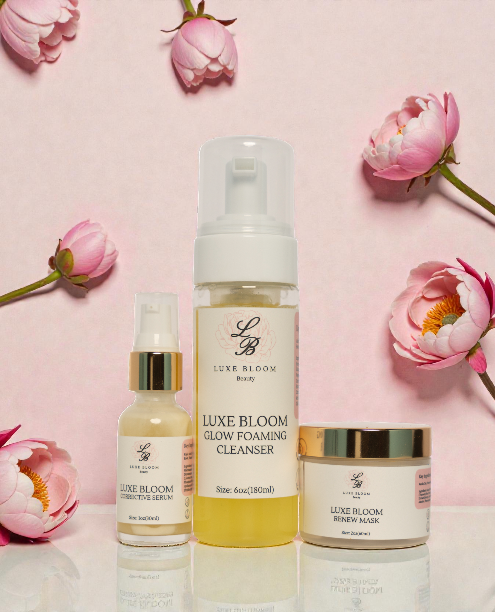 Cleanse: Start with the Glow Foaming Cleanser to remove dirt, oil, and impurities. Apply the Bloom Corrective Serum to target dark spots and even your complexion. Finish with the Luxe Moisturizer to lock in hydration and restore your glow
